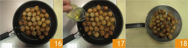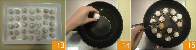 A medida que las prepares, colócalas en una bandeja 13: con estas cantidades obtendrás unas 36. Calienta un poco de aceite en una sartén antiadherente amplia. Cuando esté caliente, añade las albóndigas 14 y dóralas por todos los lados, girándolas con cuidado 15.