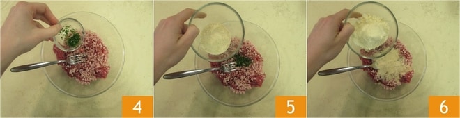 Añade el perejil picado 4, el pan rallado 5, el Parmigiano Reggiano DOP 6