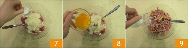 la sal 7, la pimienta y el huevo 8. Mezcla con un tenedor y cuando obtengas una mezcla homogénea añade la leche 9