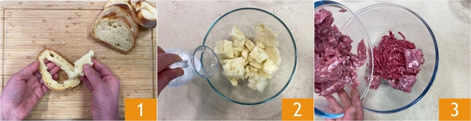 Para preparar las albóndigas en salsa de tomate, sacad la miga del pan 1, ponedla en un bol y cubridla con la leche 2. Dejadla en remojo mientras continuáis con la receta. En otro bol echad la carne picada y la salchicha 3.