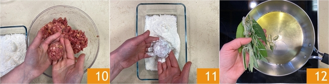 Una vez que la masa esté homogénea y se despegue fácilmente de los dedos, empezad a formar las albóndigas. Tomad una porción de unos 50 g y aplastadla ligeramente entre las manos 10: así será más fácil girarlas y quedarán perfectamente doradas. A medida que las forméis, enharinadlas ligeramente por todos los lados 11. Pasad a la cocción: en una sartén amplia calentad un chorrito de aceite con el ajo, la hoja de laurel y el romero 12.