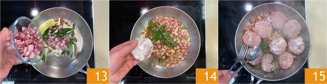 Añadid la panceta 13 y dejadla dorar hasta que esté ligeramente dorada, luego colocad las albóndigas 14 y selladlas por ambos lados durante unos diez minutos 15.