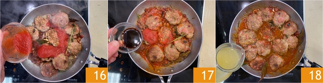 Verted la passata de tomate 16 y el vinagre balsámico 17. En cuanto se haya evaporado, añadid el caldo de carne 18.