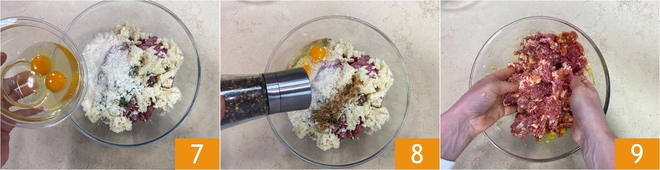 Añadid los huevos 7 y condimentad con sal, pimienta 8 y nuez moscada. Mezclad bien con las manos 9.