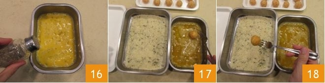 Rompe los huevos en otro recipiente, bátelos y añade la pimienta 17. Retoma las albóndigas de salmón del refrigerador y pásalas primero por los huevos batidos y luego por el panko (17-18)