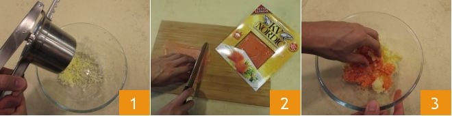Para preparar las albóndigas fritas de salmón y patatas con mayonesa rápida de pimentón, comenzad haciendo la masa para vuestras albóndigas. Aplastad las patatas 1, previamente cocidas y dejadlas templarse, colócalas en un bol bastante grande. Pica finamente el salmón con un cuchillo 2, únelo a las patatas y mezcla todo con las manos 3.