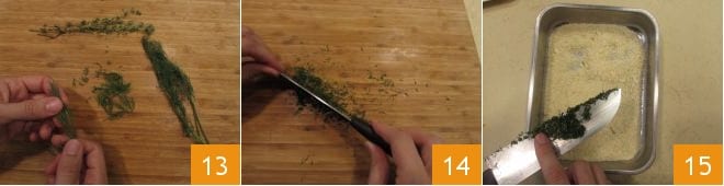 Una vez preparada la salsa de acompañamiento, dedícate al empanado para tus albóndigas de salmón. Deshoja el tomillo y el hinojo 13, pícalos finamente 14 y únelos junto con el panko en un recipiente de bordes bajos 15.