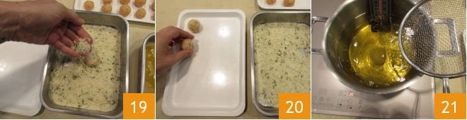 asegurándote de envolverlas completamente en el empanado 19. Luego colócalas en una bandeja 20. Vierte el aceite de girasol en una olla de bordes altos y caliéntalo hasta alcanzar la temperatura de 160-170° como máximo (utiliza un termómetro de cocina para medir la temperatura adecuada). Para no bajar la temperatura del aceite, fríe pocas albóndigas a la vez 21.