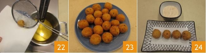 Serán suficientes unos 2 minutos de cocción para obtener albóndigas bien doradas y crujientes. Una vez listas, escurre las albóndigas utilizando una espumadera y transfiérelas a una bandeja forrada con papel absorbente para eliminar el exceso de aceite 22. Procede de esta manera hasta terminar todas las albóndigas de salmón y patatas 23 y sírvelas acompañadas con la mayonesa rápida de pimentón 24.