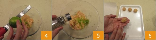 Ralla la cáscara del limón directamente dentro del bol 4 y agrega la pimienta 5. Mezcla de nuevo hasta obtener una masa homogénea y de esta masa saca 20 albóndigas de aproximadamente 20 g cada una 6, colócalas en una bandeja y guárdalas en el refrigerador durante al menos 30 minutos.