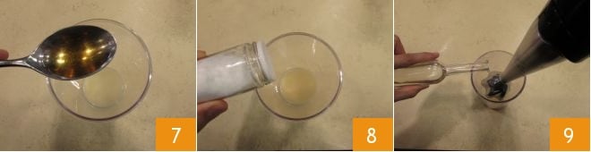 Mientras tanto, prepara la salsa de acompañamiento. Vierte en un recipiente alto la leche de soja y el vinagre de sidra 7. Añade la sal 8 y emulsiona todo con una batidora de inmersión, añadiendo el aceite de girasol en hilo 9,