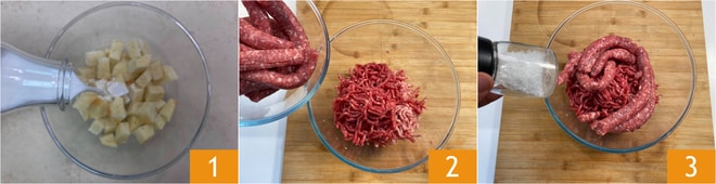 Para preparar las albóndigas guisadas lo primero que hay que hacer es cortar en trozos el pan y ponerlo a remojo en un bol con la leche 1; dejad ablandar mientras continuáis con la receta. En otro bol grande verted la carne picada de ternera, la de vacuno y la salchicha extraída de su tripa 2. Salar 3 y pimentar.