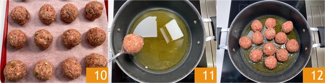 Ponédlas sobre una bandeja cubierta con papel de horno; con estas cantidades obtendréis unas 26 albóndigas 10. Calentad un poco de aceite en una sartén y, cuando empiece a chisporrotear, colocad las albóndigas asegurándoos de que todas estén en contacto con el fondo de la sartén 11. Dejadlas dorar 12.
