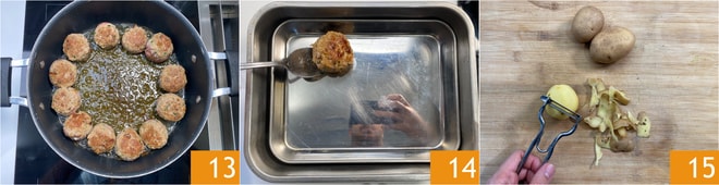 Luego giradlas y cocinadlas también por el otro lado 13. Cuando estén bien doradas por ambos lados, retiradlas de la sartén 14 y reservadlas. Pelad las patatas 15.