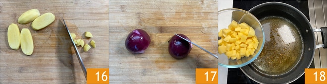 Cortadlas en cubos 16. Limpiad y cortad la cebolla roja en rodajas gruesas 17. Ahora calentad nuevamente la sartén con el fondo de cocción de las albóndigas, verted las patatas 18.