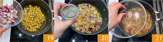 Añadid las cebollas 19, una pizca de sal y luego desglasad con el vino blanco 20. Dejad que se evapore el alcohol, luego cubrid con la tapa y cocinad durante 15 minutos 21.