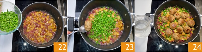 Después añadid también los guisantes 22 y las albóndigas 23, mezclad suavemente y verted el caldo caliente 24.