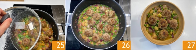 Cubrid de nuevo con la tapa 25 y cocinad por otros 5 minutos. Las albóndigas guisadas están listas 26, servidlas bien calientes 27!