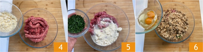 Incorporad el Parmigiano Reggiano DOP rallado 4, el perejil picado 5, el pan bien escurrido y 2 huevos 6.