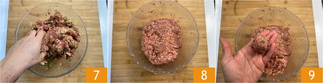 Amasad con las manos 7 para obtener una mezcla compacta y uniforme 8. Tomad aproximadamente 50 g de masa cada vez y formad albóndigas, redondeándolas entre las palmas de las manos 9.