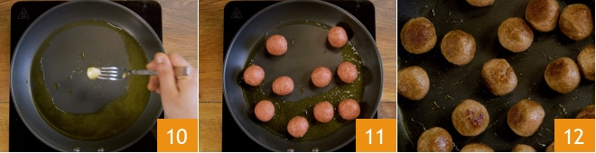Vierte un poco de aceite en una sartén, enciende el fuego, añade un diente de ajo y déjalo que tome sabor 10. Cuando comience a dorarse, retíralo, añade las albóndigas 11 y déjalas dorar bien por todos los lados 12.