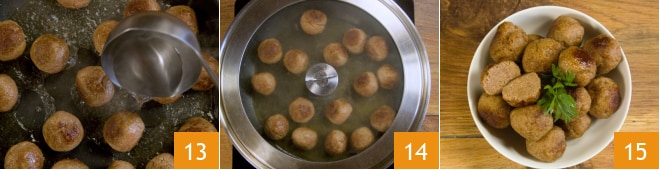 Añade un poco de agua caliente 13, cubre con una tapa 14 y deja cocinar durante 10 minutos a fuego lento. ¡Sirve tus albóndigas todavía calientes 15!