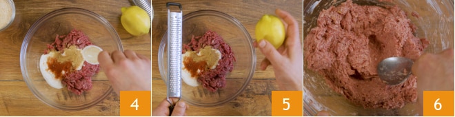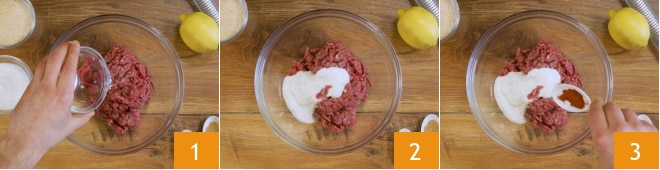 Para preparar las albóndigas sin huevo, pon la mezcla de carne picada en un bol. Añade el agua 1 y el yogur blanco 2. Salpimienta y aromatiza con el pimentón 3,