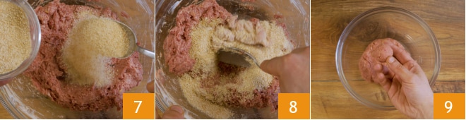 Ahora debes agregar poco a poco el pan rallado 7, mezcla nuevamente 8. Debes obtener una mezcla homogénea, suave pero al mismo tiempo compacta, por lo que deberás ajustar la cantidad exacta de pan rallado a utilizar (necesitarás aproximadamente 25 g). Forma bolitas de 30 g cada una 9, obtendrás unas 18.