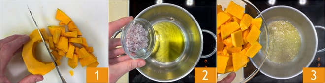 Para preparar las albóndigas veganas cremosas, como primer paso prepara el caldo vegetal siguiendo nuestra receta. Limpia la calabaza y córtala en cubos 1. En una olla vierte el aceite, añade la chalota 2 y sofríe durante unos minutos. Luego añade la calabaza 3.