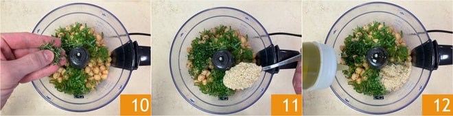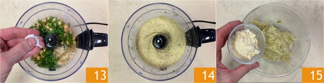Regula de sal 13 y pimienta, luego tritura hasta obtener una mezcla homogénea 14. Transfiere todo a un bol y añade la harina de garbanzo 15.