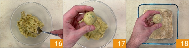 Mezcla hasta obtener una masa modelable 16. Forma las albóndigas 17 y pásalas por el pan rallado 18.