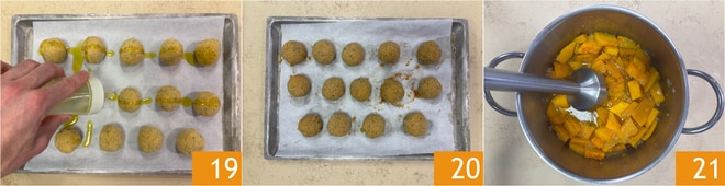 Coloca las albóndigas en una bandeja cubierta con papel de horno y rocía con un chorrito de aceite 19. Cocina en horno ventilado precalentado a 200°C durante unos 25 minutos, dándoles la vuelta a la mitad de la cocción 20. Retira las hierbas aromáticas y tritura con una batidora de inmersión 21 hasta obtener una crema lisa y homogénea.