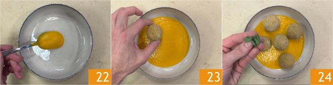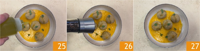 Estáis listos para emplatar: distribuid en el fondo del plato la crema de calabaza 22, luego colocad las albóndigas 23 y algunas hojitas de mejorana 24.