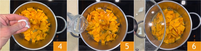 Regula de sal 4 y pimienta, luego aromatiza con tomillo y laurel. Cubre con caldo vegetal 5, cierra con tapa 6 y cocina a fuego medio durante unos 20 minutos, hasta que la calabaza esté suave.