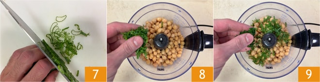 Mientras tanto, corta finamente una cebolleta 7 y colócala en un procesador 8 junto con los garbanzos y el perejil picado 9.