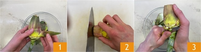 Para preparar las alcachofas hervidas, lo primero que hay que hacer es cortar un limón por la mitad. Exprímelo en un recipiente y resérvalo, mientras que la otra mitad la exprimes en un bol grande lleno de agua fría. Pon al fuego una olla llena de agua con sal, que servirá para la cocción. Limpia las alcachofas: quita todas las hojas más externas y correosas 1, corta la punta de las alcachofas con un cuchillo 2 y elimina las partes en la base de la alcachofa, ayudándote con un cuchillo más pequeño 3.