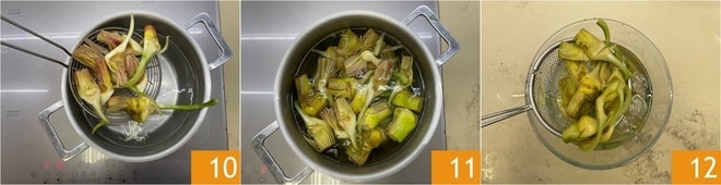 Tan pronto como el agua alcance el punto de ebullición, sumerge las alcachofas 10 y cocínalas 11 durante aproximadamente 8 minutos, o hasta que estén tiernas. Estas alcachofas se consumirán templadas, así que, una vez escurridas, puedes enfriarlas en agua fría (eventualmente con hielo) para detener la cocción y mantener una consistencia más firme 12