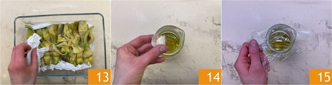 Luego, sécalas bien tamponándolas con papel de cocina 13. Prepara el condimento: en un recipiente de vidrio vierte el aceite y un diente de ajo aplastado 14, cubre con film transparente 15 y calienta en el microondas durante aproximadamente 1 minuto, deteniéndolo cada 20 segundos. Deja enfriar.