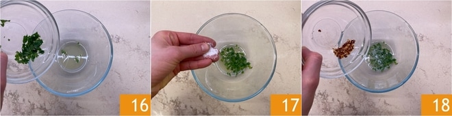 En un bol, une el jugo de limón, la menta desmenuzada 16, la sal 17 y el pimiento rojo seco 18.