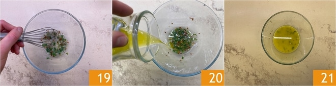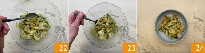Condimenta las alcachofas hervidas con el aceite aromatizado 22, mezcla bien 23 y sirve 24.