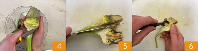 Pela el tallo 4 y divide la alcachofa por la mitad 5. Ahora elimina la pelusa interna con un cuchillo pequeño o una cuchara 6.