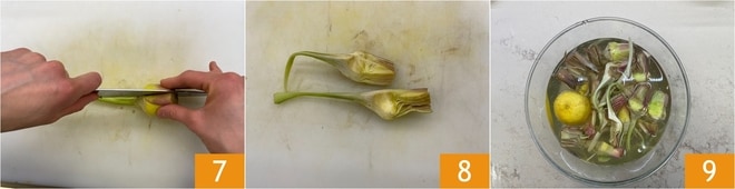 Divídela nuevamente por la mitad 7, para obtener dos cuartos 8. De cada alcachofa obtendrás 4 cuartos, colócalos en el bol con agua fría acidulada con limón para que no se oscurezcan 9