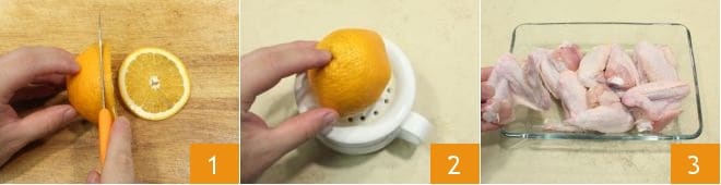 Para preparar las alitas de pollo especiadas con puré rico de patatas y espinacas, comienza con la marinada del pollo (si prefieres una carne aún más aromática puedes dejar marinar las alitas toda una noche en el frigorífico). Corta media naranja 1, mientras que la otra mitad puedes exprimirla y colar el jugo 2. Luego coloca las alitas de pollo en una fuente amplia teniendo cuidado de no superponerlas 2; añade la mitad de la dosis de salsa de soja