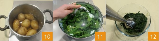 Mientras tanto, prepara la guarnición: cuece las patatas en abundante agua hirviendo ligeramente salada 10 y estofa las espinacas, lavadas cuidadosamente y bien escurridas previamente, en la sartén con un chorrito de aceite y sal al gusto, tapadas 11. Cuando estén blandas, transfiérelas a un bol y conviértelas en crema con una batidora de inmersión 12.