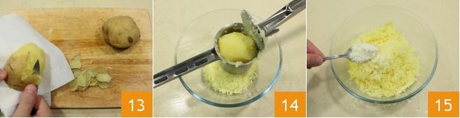 Cuando las patatas estén cocidas, pélalas aún calientes 13 y machácalas recolectándolas en un bol 14; añade el queso rallado 15