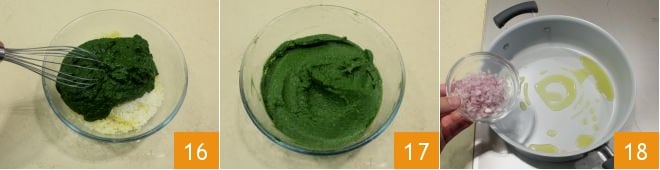 añade también la crema de espinacas 16, sala y pimienta, y mezcla para integrar todo 17. Mantén el puré caliente en el horno apagado con la luz encendida por ejemplo; mientras tanto en una sartén vierte el aceite y la chalota pelada y picada 18.