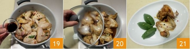 Déjala dorar a fuego lento removiendo de vez en cuando, luego añade el pollo escurrido de la marinada y la otra mitad de la dosis de salsa de soja 19. Gira las alas para dorarlas por ambos lados, luego tapa con una tapa 20 y cocina a fuego moderado durante unos 30 minutos y ajusta de sal si es necesario. Una vez listas, sirve las alitas de pollo especiadas con puré rico de patatas y espinacas 21.