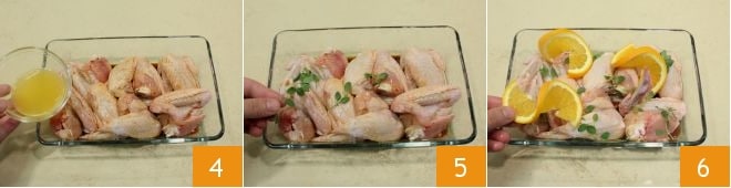 y el jugo de naranja 4. Luego aromatiza con las hojitas de mejorana 5, las rodajas de naranja 6 y la cáscara de lima;