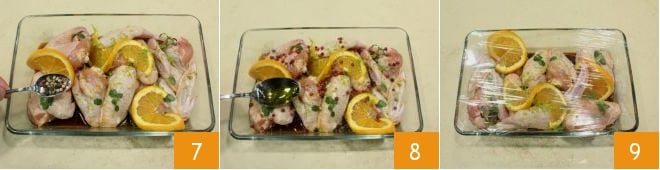 añade sal y pimienta 7, luego rocía con aceite 8 y cubre con film 9: coloca en la nevera durante al menos 2 horas para marinar, dándoles la vuelta de vez en cuando para distribuir uniformemente la marinada.