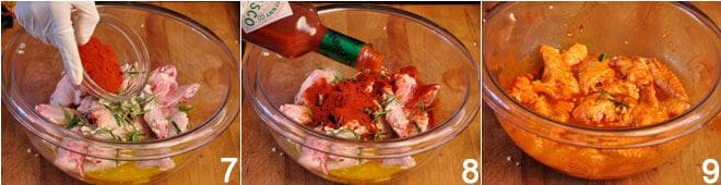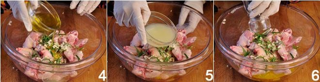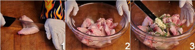 Se comienza cortando las alitas de pollo a lo largo de las uniones de los huesos 1 eliminando la parte delgada. Colocar todas las alitas en un recipiente 2. Añadir gradualmente los ingredientes de la marinada: romero, ajo picado 3,